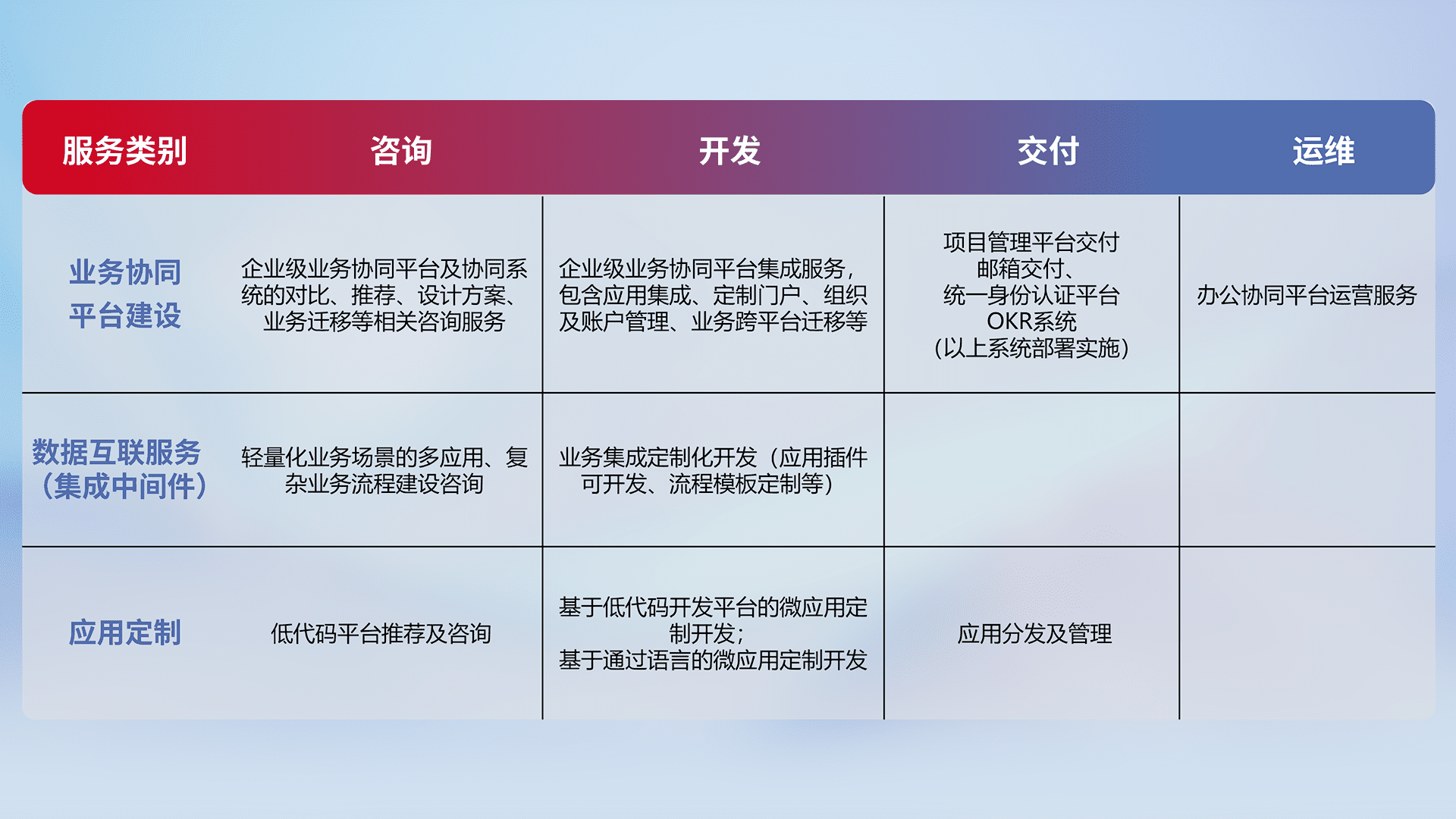 针对钉钉、、企微、、、、IDaas等平台级产品提供产品的规划、、、、方案、、、、交付、、、、定制化开发等服务,,,实现如统一协同办公、、智能客户服务、、、、混合会议管理、、、、智能数据查询、、、、等业务场景,,,,实现数字化转型。。。